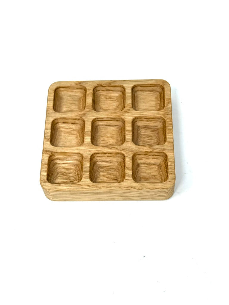 Each tray features nine smooth, rounded compartments, precision-carved from solid wood to prevent beads from rolling or mixing. The edges are softly contoured so materials lift easily without catching or tipping — every detail shaped for a calm, functional workspace.
