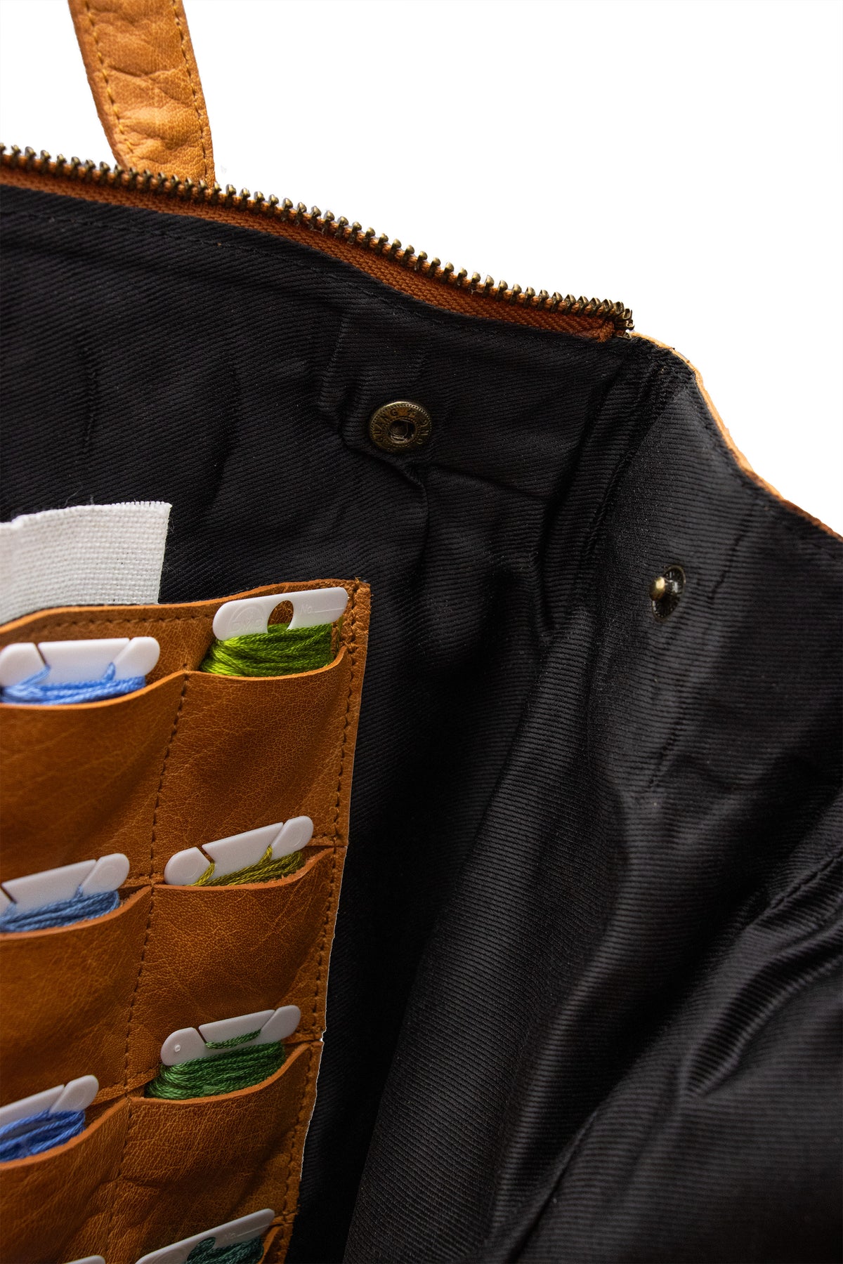 Fro is a stylish and functional project bag featuring a unique circular design, perfect for carrying your embroidery projects with ease. With a height of 30 cm and a length of 42 cm, this spacious embroidery bag provides ample room for your embroidery supplies, ensuring that everything you need is neatly organized and easily accessible.