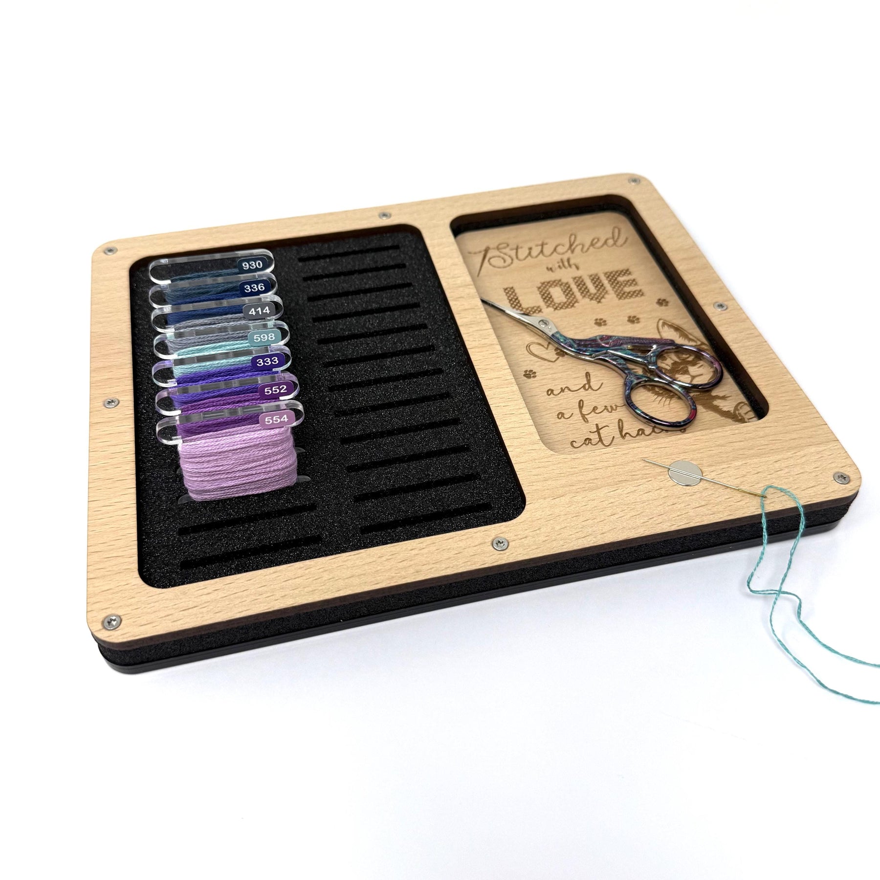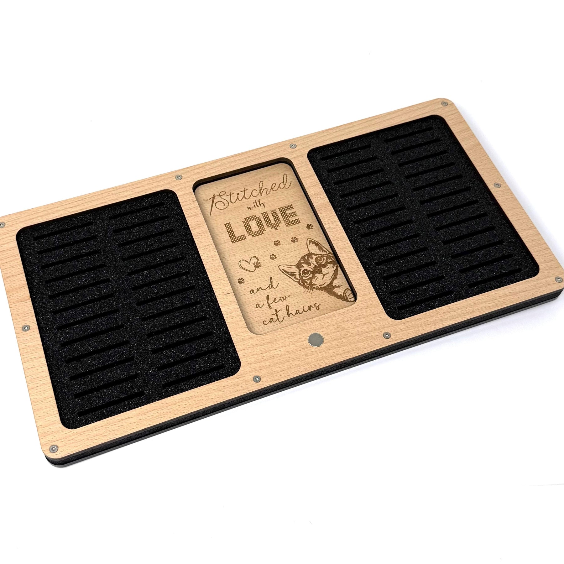 Say goodbye to hunting for lost bobbins with this cat themed Bobbin Working Tray. Designed to keep your sewing space calm and clutter-free, it’s available in two sizes—holding either 24 or 48 bobbins. It also features a magnetic needle holder, plus handy spaces for scissors and small tools, so everything you need is right where it should be.